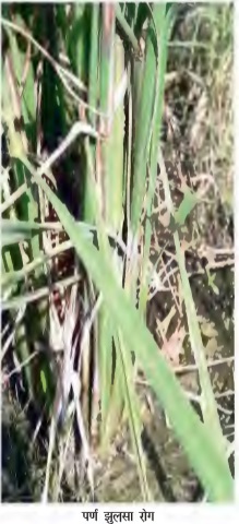 पर्ण झुलसा/शीथ झुलसा (Rhizoctonia solani): नर्सरी से ही पौधे सड़ने लगते हैं, और पत्तियों पर अनियमित आकार के गहरे भूरे धब्बे बनते हैं। यह उच्च उत्पादकता वाली किस्मों में 50% तक नुकसान कर सकता है। प्रबंधन में बीज उपचार (Pseudomonas fluorescens या Trichoderma), और कार्बेंडाज़िम, प्रोपिकोनाज़ोल, या हेक्साकोनाज़ोल का छिड़काव शामिल है। फसल अवशेषों और खरपतवारों का नियंत्रण भी आवश्यक है।