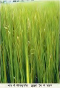 जीवाणुधारी झुलसा (Xanthomonas oryzae pv. oryzae): पत्तियों पर कत्थई रंग की धारियां बनती हैं। प्रबंधन में रोग प्रतिरोधी किस्मों का चुनाव, एग्रीमाइसीन या सेरेसान से बीज उपचार, और Pseudomonas fluorescens से बीज और पौध उपचार, साथ ही स्ट्रेप्टोसायक्लिन और कॉपर ऑक्सीक्लोराइड का छिड़काव शामिल है।