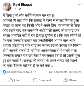 👉 “बरसों से रायगढ़ में सांसद निवास हुआ करता था, पर आज वह किसी और का दफ्तर है और एक जनजातीय सांसद को अब तक बंगला अलॉट नहीं हुआ। क्या आदिवासी सांसद को हक पाने के लिए नेताओं और अफसरों की एड़ियों पर नाक रगड़नी पड़ेगी?”