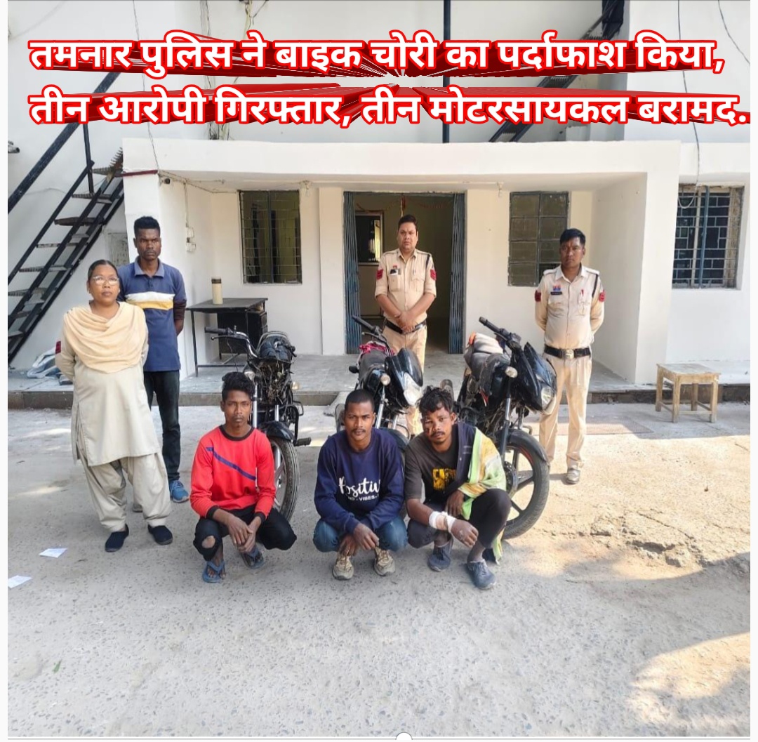 रायगढ़, 13 नवंबर। तमनार पुलिस ने सक्रिय कार्रवाई करते हुए मोटरसायकल चोरी के मामले का खुलासा कर तीन आरोपियों को गिरफ्तार किया है। आरोपियों के कब्जे से चोरी की तीन बाइक बरामद की गई हैं, जिनकी कुल कीमत लगभग डेढ़ लाख रुपए बताई जा रही है। पुलिस ने आरोपियों को न्यायालय में पेश कर रिमांड पर भेजा है।
