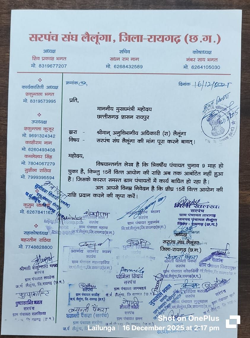 लैलूंगा। पंचायती राज व्यवस्था की रीढ़ मानी जाने वाली ग्राम पंचायतें आज आर्थिक तंगी से कराह रही हैं। 15वें वित्त आयोग की राशि अब तक जारी नहीं होने से विकास कार्य पूरी तरह ठप पड़े हैं। चुनाव संपन्न हुए 9 माह से अधिक का समय बीत चुका है, लेकिन सरकार की ओर से ग्राम पंचायतों को एक भी रुपया न मिलने से आक्रोश बढ़ता जा रहा है। इसी कड़ी में आज सरपंच संघ लैलूंगा ने एकजुट होकर अनुविभागीय अधिकारी (राजस्व) लैलूंगा के माध्यम से राज्य शासन के नाम ज्ञापन सौंपा।