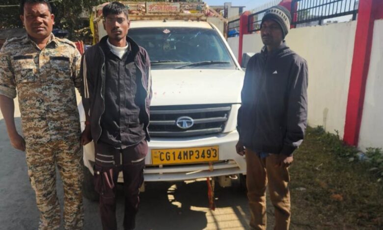 जांच के दौरान वाहन में करीब 25 क्विंटल धान लोड पाया गया, जिसका परिवहन किया जा रहा था। वाहन में सवार व्यक्तियों की पहचान तरूण सिदार पिता मोहित राम सिदार (उम्र 21 वर्ष, निवासी सुस्डेगा मुड़ापारा, थाना पत्थलगांव, जिला जशपुर) एवं हेमन्त सिदार पिता शिवशंकर सिदार (उम्र 29 वर्ष, निवासी केरजू, चौकी केरजू, थाना सीतापुर, जिला सरगुजा) के रूप में हुई।