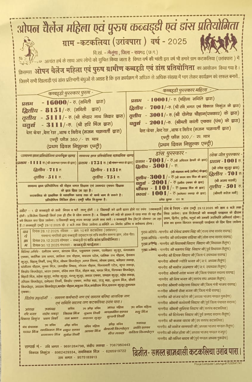 लैलूंगा, कटकलिया/ कटकलिया में नए वर्ष एवं क्रिसमस के शुभ अवसर में ओपन चैलेंज महिला एवं पुरुष कब्बड्डी का शानदार आयोजन, जो कि लगातार 9 वर्षों से होता आ रहा है, जिसमें आसपास और दूरदराज के खिलाड़ी एवं खेल प्रेमियों का प्रतियोगिता में भाग लेने के लिए शामिल होती हैं। इस बार का आयोजन में बहुत सुंदर और आकर्षक और खेल प्रेमियों के द्वारा खिलाड़ियों को प्रोत्साहित और सुंदर प्रदर्शन करने की प्रेरित करते हुए लोग आनंदित हो रहे थे।