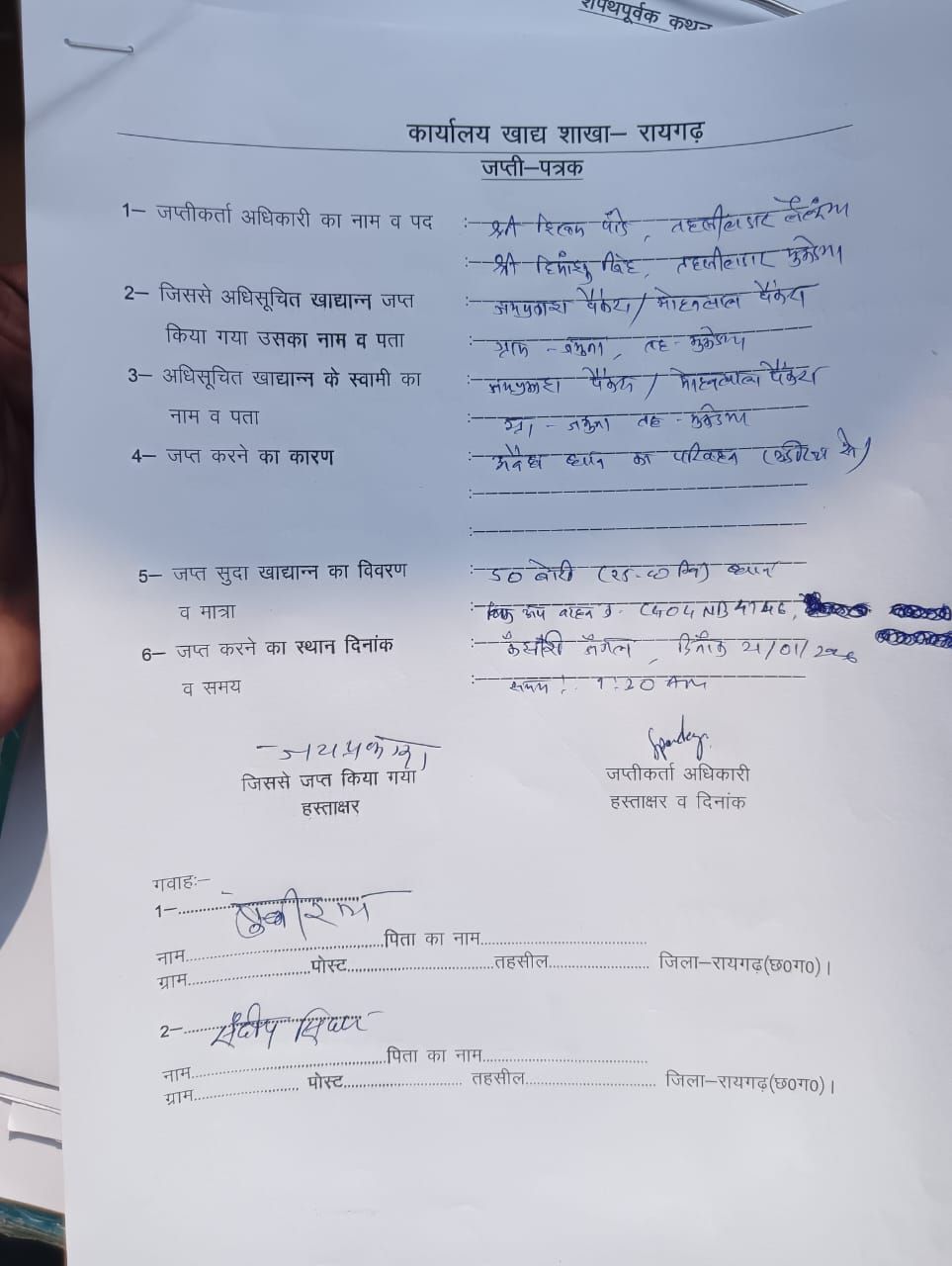 लैलूंगा/लैलूंगा क्षेत्र में अवैध धान कारोबार के खिलाफ प्रशासन ने एक बार फिर कड़ा रुख अपनाते हुए बड़ी कार्रवाई को अंजाम दिया है। तहसीलदार लैलूंगा शिवम पांडे, नायब तहसीलदार हिमांशु सिंह एवं फूड इंस्पेक्टर खुशी राम की संयुक्त टीम ने गुप्त सूचना के आधार पर जयप्रकाश पैंकरा पिता मोहन लाल पैंकरा, निवासी जमुना को अवैध धान एवं पिकअप वाहन सहित जमुना के घनघोर जंगल में धर दबोचा।