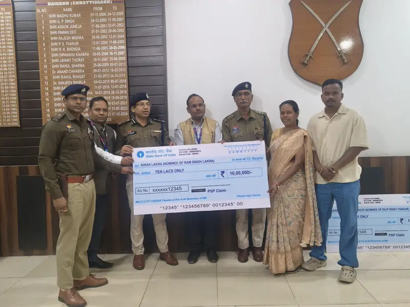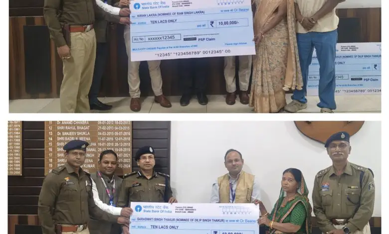 रायगढ़, 3 फरवरी। ड्यूटी के दौरान आकस्मिक निधन होने पर जिले में पदस्थ स्वर्गीय प्रधान आरक्षक दिलीप ठाकुर की पत्नी श्रीमती सरस्वती सिंह ठाकुर एवं जीआरपी थाने में पदस्थ स्वर्गीय राम सिंह लकड़ा की पत्नी श्रीमती किरण लकड़ा को पुलिस सैलरी पैकेज के अंतर्गत 10–10 लाख रुपये की बीमा राशि का चेक प्रदान किया गया। यह सहायता राशि वरिष्ठ पुलिस अधीक्षक शशि मोहन सिंह एवं एसबीआई शाखा पुसौर के प्रबंधक द्वारा सौंपते हुए शोकसंतप्त परिवारों के प्रति गहरी संवेदना व्यक्त की गई।