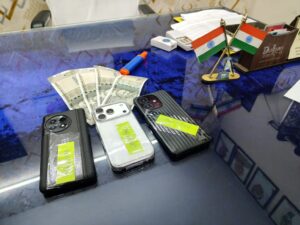 नकदी रकम ₹2000 तथा 3 मोबाइल फोन (आईफोन, वन प्लस, ओप्पो), कुल अनुमानित मूल्य ₹82,000।
