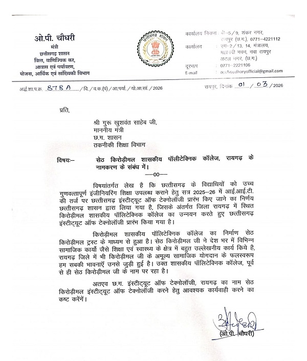 छ.ग. इंस्टीट्यूट ऑफ टेक्नोलॉजी, रायगढ़ का नाम सेठ किरोड़ीमल इंस्टीट्यूट ऑफ टेक्नोलॉजी करने हेतु आवश्यक कार्यवाही किए जाने का किया आग्रह