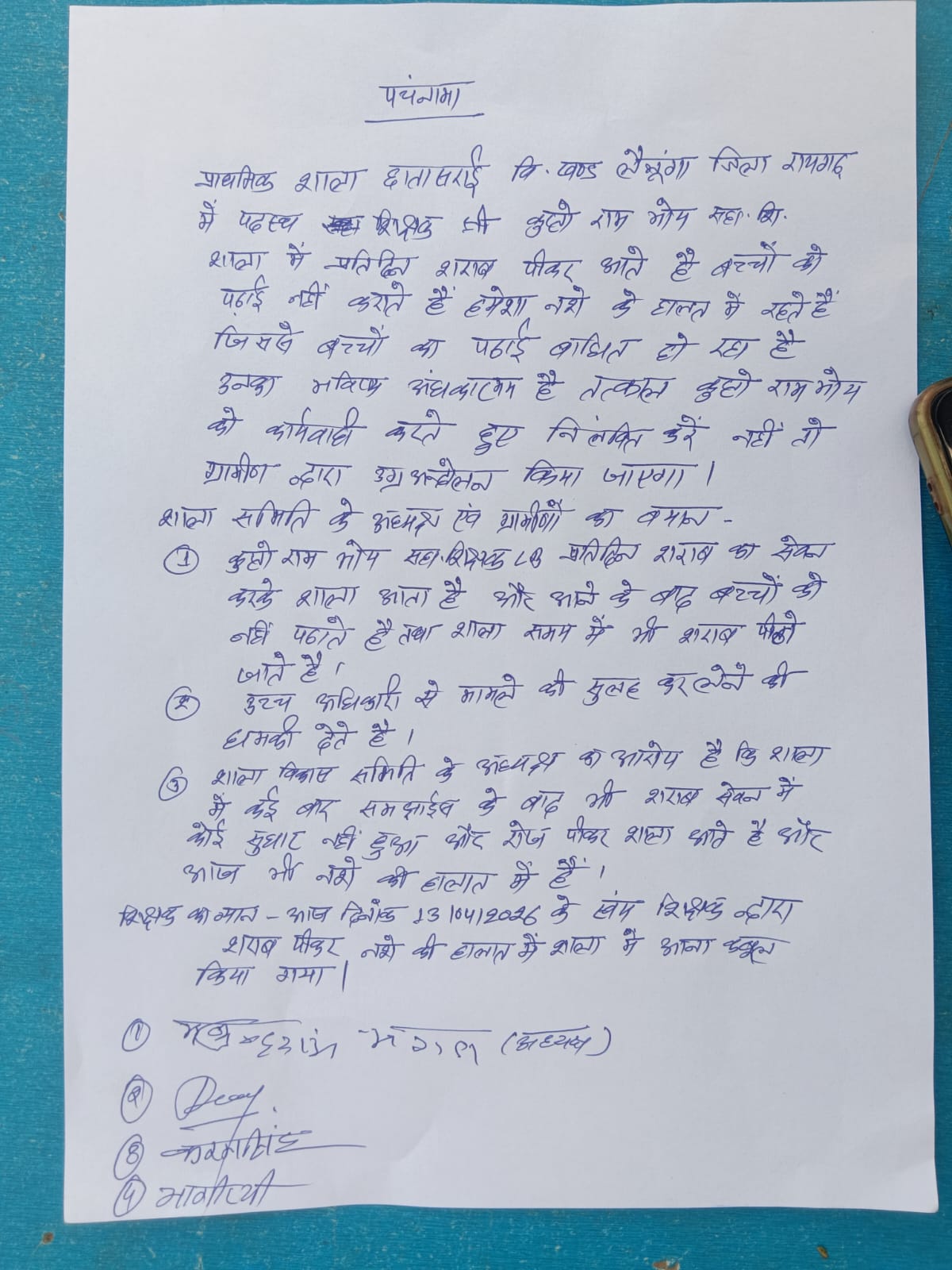 क्लास में लड़खड़ाती जुबान और गलत हरकतें ग्रामीणों और अभिभावकों का आरोप है कि शिक्षक श्री कुष्टो राम भोय न केवल शराब पीकर स्कूल आता है, बल्कि नशे की हालत में छात्रों और शाला समिति एवं पालक समिति के द्वारा कई बार अवगत कराए जाने के बावजूद भी अपने कर्तव्य से विमुख शराब का अड्डा बनाकर विद्यालय जैसे शिक्षा मंदिर को कलंकित कर बच्चों के भविष्य से खिलवाड़ बर्दाश्त करने योग्य नहीं है।