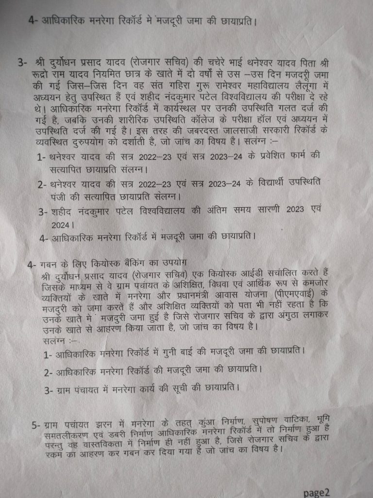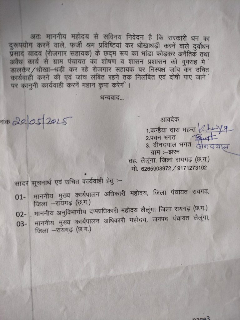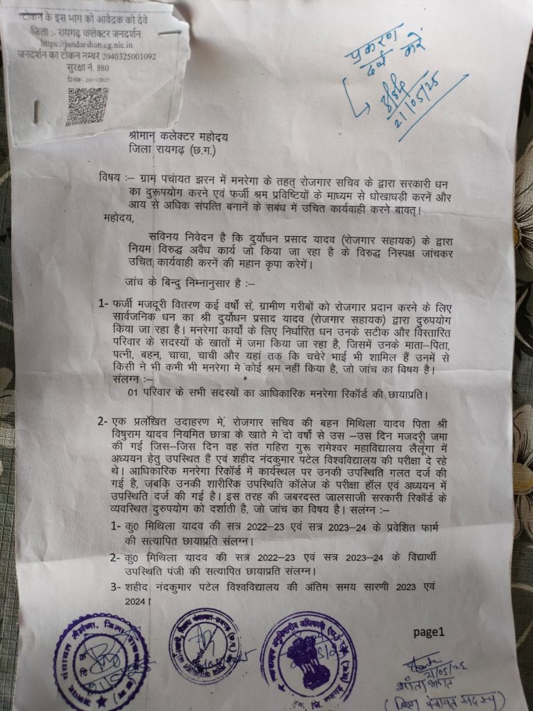 लैलूंगा / रायगढ़ जिले के लैलूंगा जनपद पंचायत के ग्राम पंचायत झरन में महात्मा गांधी राष्ट्रीय ग्रामीण रोजगार गारंटी अधिनियम (मनरेगा) के तहत व्यापक भ्रष्टाचार करने का मामला सामने आया है जिसकी शिकायत गांव के ग्रामीणों ने अनुविभागीय अधिकारी से की है ग्राम झरन निवासी कन्हैया दास महंत, घनश्याम यादव, पवन भगत रवि भगत, दीनदयाल भगत, शत्रुधन भगत,मोनो भगत, प्रकाश भगत, प्रताप भगत सेतो भगत,अमित भगत मनमोहन सारथी,जयप्रकाश भगत, संतराम भगत सहित अन्य ग्रामीणों ने चौंकाने वाले खुलासे किये हैं। वर्तमान में मनरेगा रोजगार सचिव के पद पर कार्यरत दुर्योधन प्रसाद यादव पर सरकारी धन का दुरुपयोग करने, फर्जी श्रम प्रविष्टियों के माध्यम से धोखाधड़ी करने और अपनी आधिकारिक आय से कहीं अधिक निजी संपत्ति बनाने के गंभीर आरोप लगे हैं। आपको बता दे कि रोजगार सहायक ने अपनी बहन के नाम पर मस्टरोल भर राशि आहरण करने का आरोप भी है ।